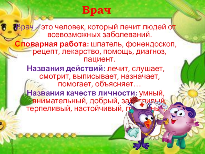 действий: лечит, слушает, смотрит, выписывает, назначает, помогает, объясняет…