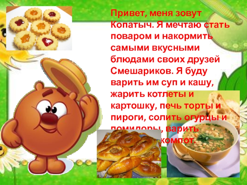 Слайд 4Привет, меня зовут Копатыч. Я мечтаю стать поваром и накормить