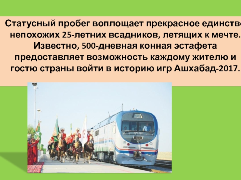 Слайд 2117 джигитов вестников Азиады-2017 на ахалтекинских конях с Олимпийским факелом,