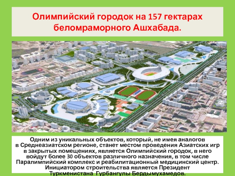 Слайд 5Олимпийский городок на 157 гектарах беломраморного Ашхабада.