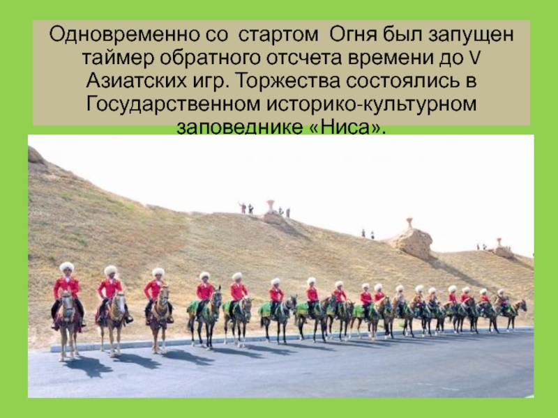 игр в 17:00, рядом с памятниками Нисы дан старт конному пробегу из 17 наездников. Он продолжается в каждом велаяте 100 дней. Начался пробег с Ахалского велаята, после по территории Балканского, Дашогузского и Лебапского велаятов. Заключительный этап конного пробега пройдет по территории Марыйского велаята. На газовом месторождении «Галкыныш» состоится церемония зажжения факела. Затем конная группа направится в сторону Ашхабада до Олимпийского стадиона, где пройдет торжественная церемония зажжения огня Азиатских игр
