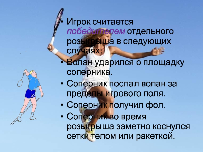 Игрок считается победителем отдельного розыгрыша в следующих случаях:Волан ударился о площадку соперника. Соперник послал волан за пределы