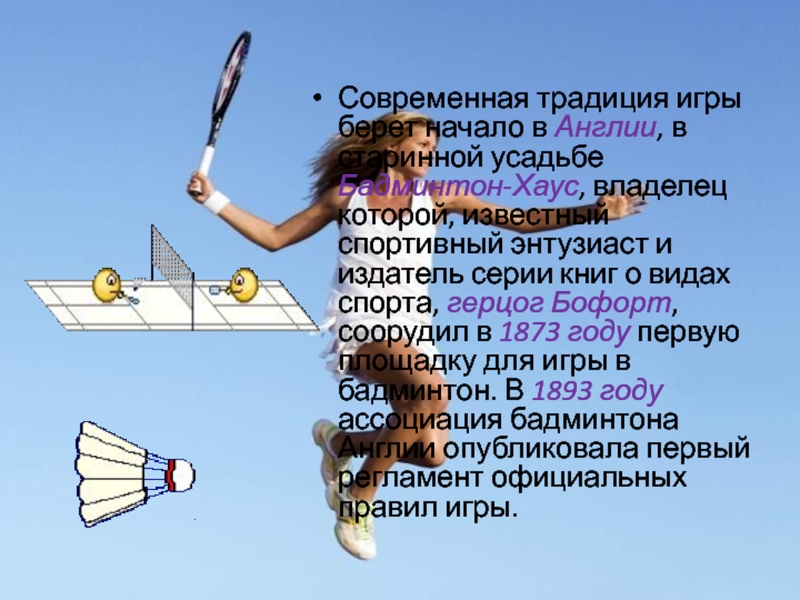 о видах спорта, герцог Бофорт, соорудил в 1873 году первую площадку для игры в бадминтон. В 1893 году ассоциация бадминтона Англии опубликовала первый регламент официальных правил игры.