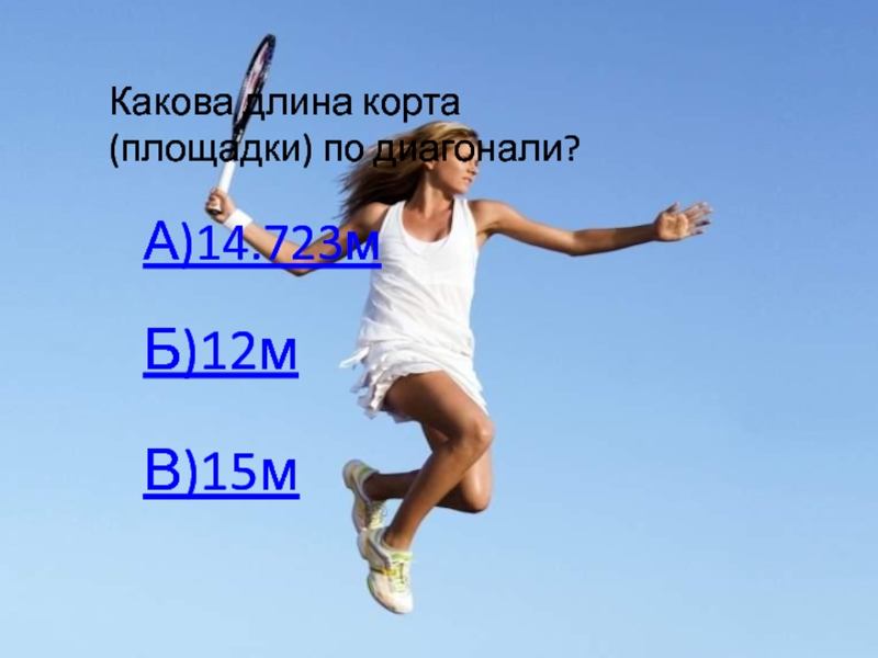 Слайд 13Какова длина корта(площадки) по диагонали?