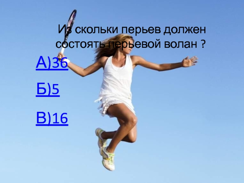 Из скольки перьев должен состоять перьевой волан ?А)36Б)5В)16