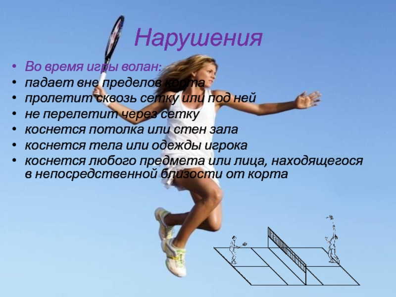 НарушенияВо время игры волан:падает вне пределов кортапролетит сквозь сетку или под нейне перелетит через сеткукоснется потолка или