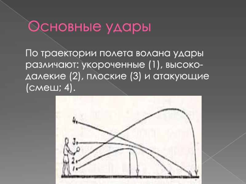 Основные ударыПо траектории полета волана удары различают: укороченные (1), высоко-далекие (2), плоские (3) и атакующие (смеш; 4).