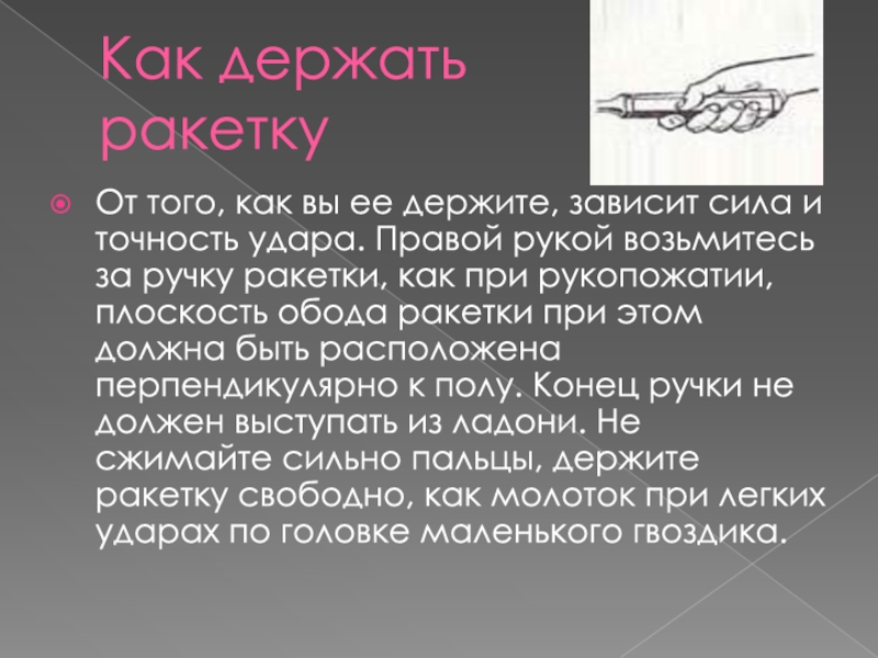 при рукопожатии, плоскость обода ракетки при этом должна быть расположена перпендикулярно к полу. Конец ручки не должен выступать из ладони. Не сжимайте сильно пальцы, держите ракетку свободно, как молоток при легких ударах по головке маленького гвоздика.