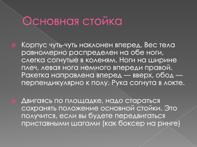 левая нога немного впереди правой. Ракетка направлена вперед — вверх, обод — перпендикулярно к полу. Рука согнута в локте.