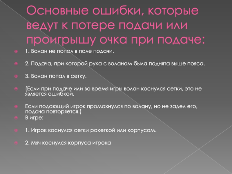 Слайд 13Основные ошибки, которые ведут к потере подачи или проигрышу очка