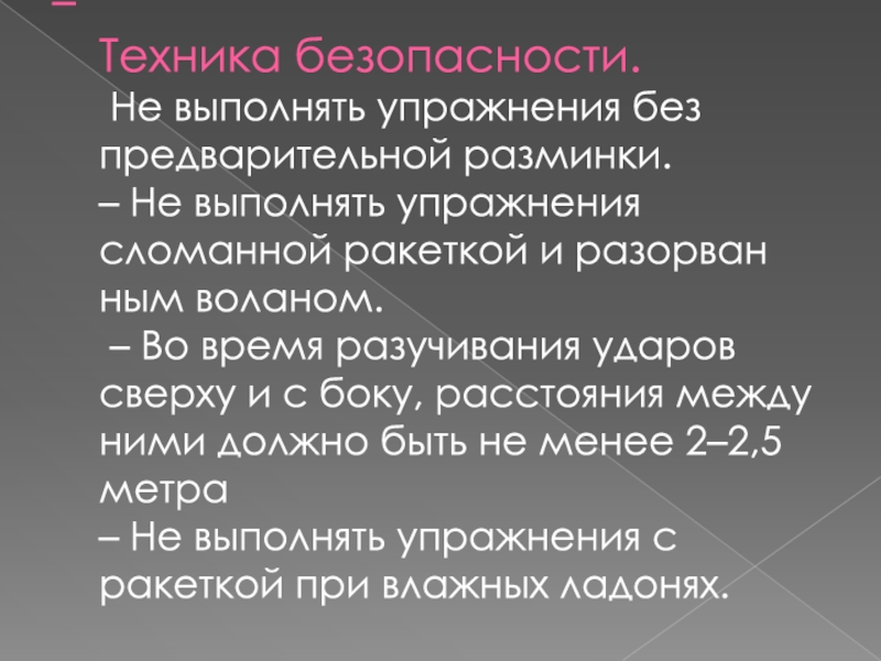 – Техника безопасности.  Не выполнять упражнения без предварительной разминки. – Не выполнять упражнения сломанной ракеткой и разор­ван­ным воланом.