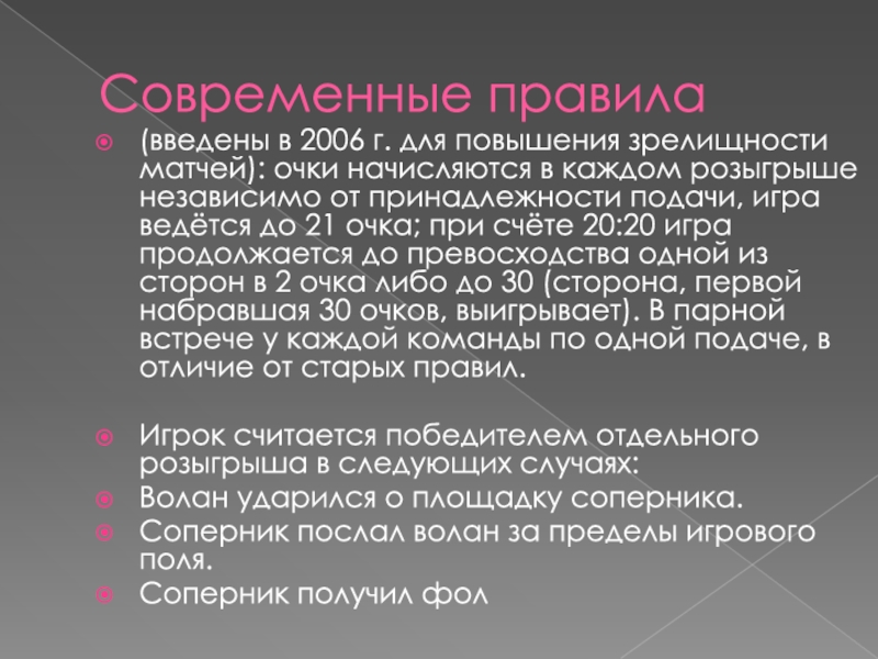 Современные правила(введены в 2006 г. для повышения зрелищности матчей): очки начисляются в каждом розыгрыше независимо от принадлежности