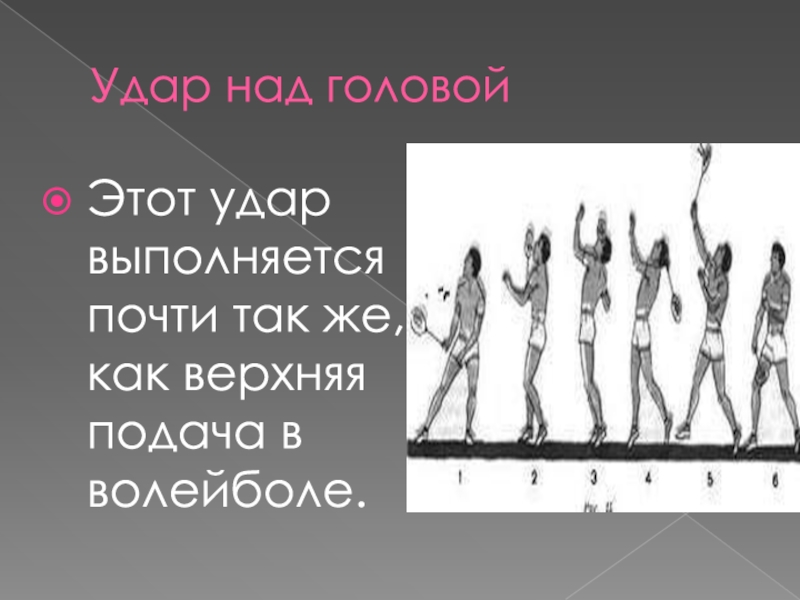 Удар над головойЭтот удар выполняется почти так же, как верхняя подача в волейболе.