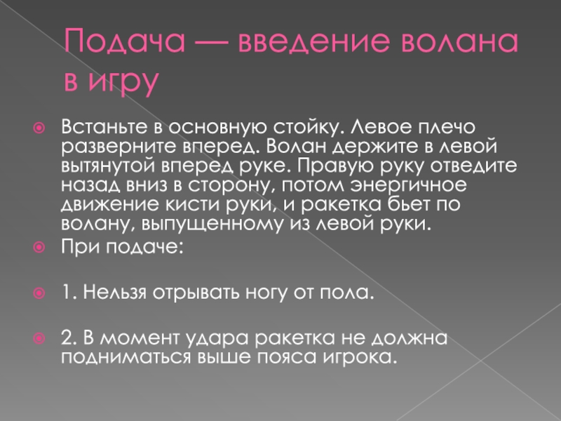 Подача — введение волана в игруВстаньте в основную стойку. Левое плечо разверните вперед. Волан держите в левой