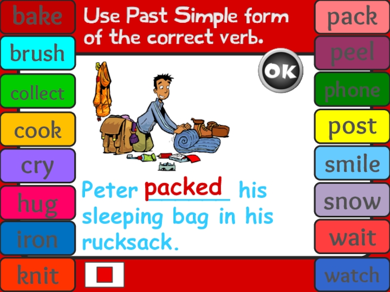Peter ______ his sleeping bag in his rucksack.packedbakebrushcollectcookcryhugironknitpackpeelphonepostsmilesnowwaitwatch