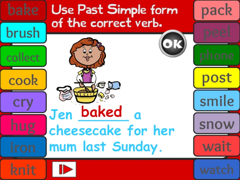Jen ______ a cheesecake for her mum last Sunday.bakedbakebrushcollectcookcryhugironknitpackpeelphonepostsmilesnowwaitwatch