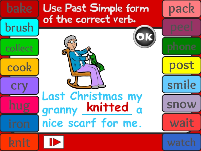 Last Christmas my granny _______ a nice scarf for me.knittedbakebrushcollectcookcryhugironknitpackpeelphonepostsmilesnowwaitwatch