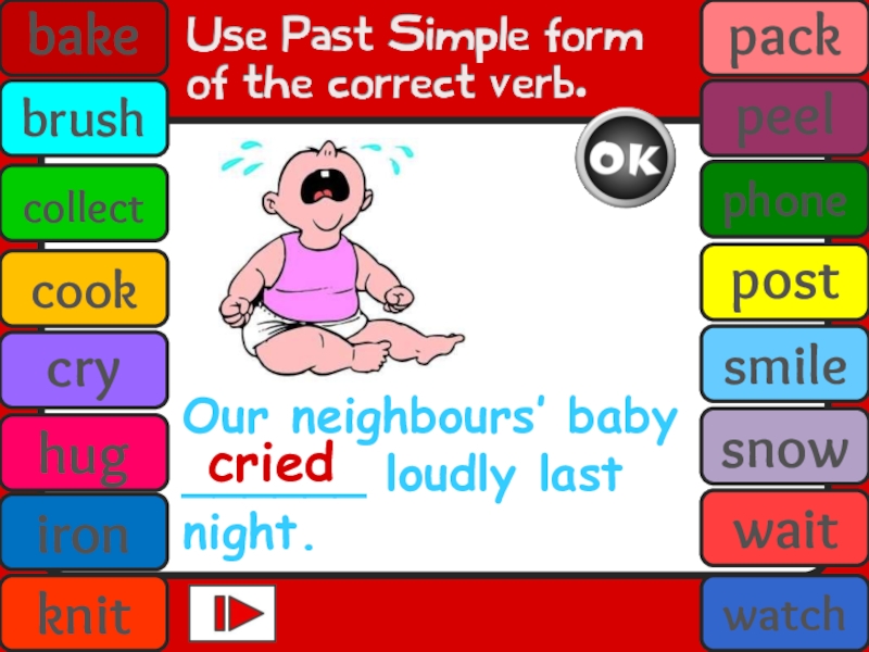 Our neighbours’ baby ______ loudly last night. criedbakebrushcollectcookcryhugironknitpackpeelphonepostsmilesnowwaitwatch
