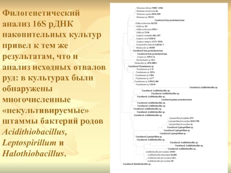 обнаружены многочисленные «некультивируемые» штаммы бактерий родов Acidithiobacillus, Leptospirillum и Halothiobacillus.