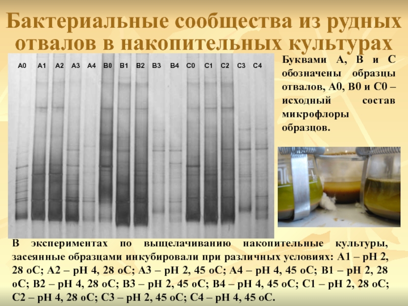 Слайд 32Бактериальные сообщества из рудных отвалов в накопительных культурах