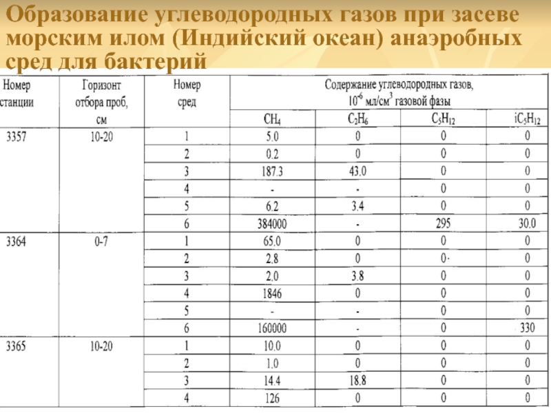 Слайд 25Образование углеводородных газов при засеве морским илом (Индийский океан) анаэробных