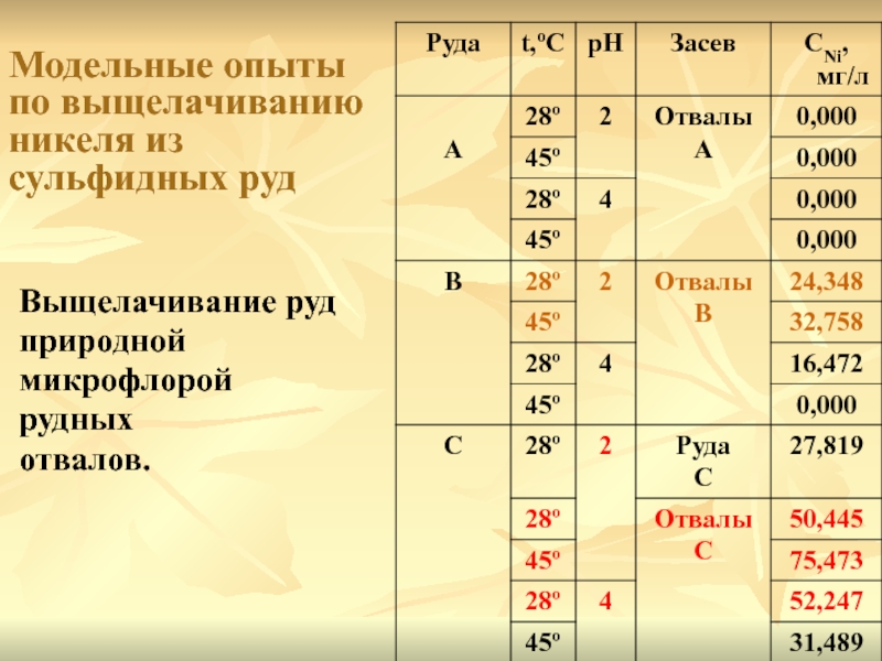 Слайд 38Выщелачивание никеля культурами бактерий H. halophilus и Acidithiobacillus sp. из