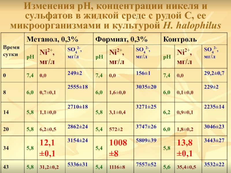Слайд 41Изменения рН, концентрации никеля и сульфатов в жидкой среде с
