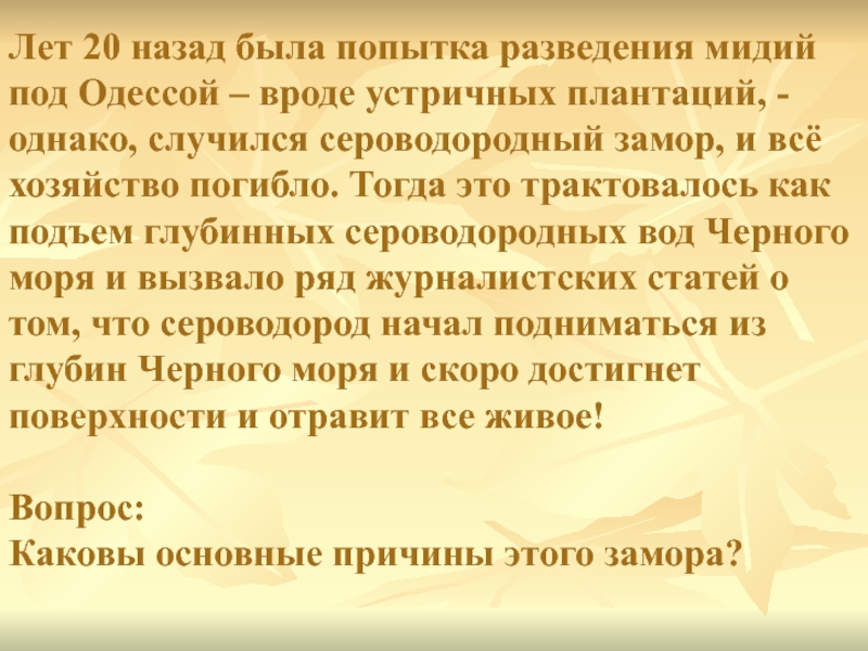 хозяйство погибло. Тогда это трактовалось как подъем глубинных сероводородных вод Черного моря и вызвало ряд журналистских статей о том, что сероводород начал подниматься из глубин Черного моря и скоро достигнет поверхности и отравит все живое!