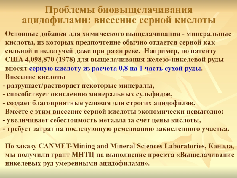 Слайд 29Проблемы биовыщелачивания ацидофилами: внесение серной кислоты