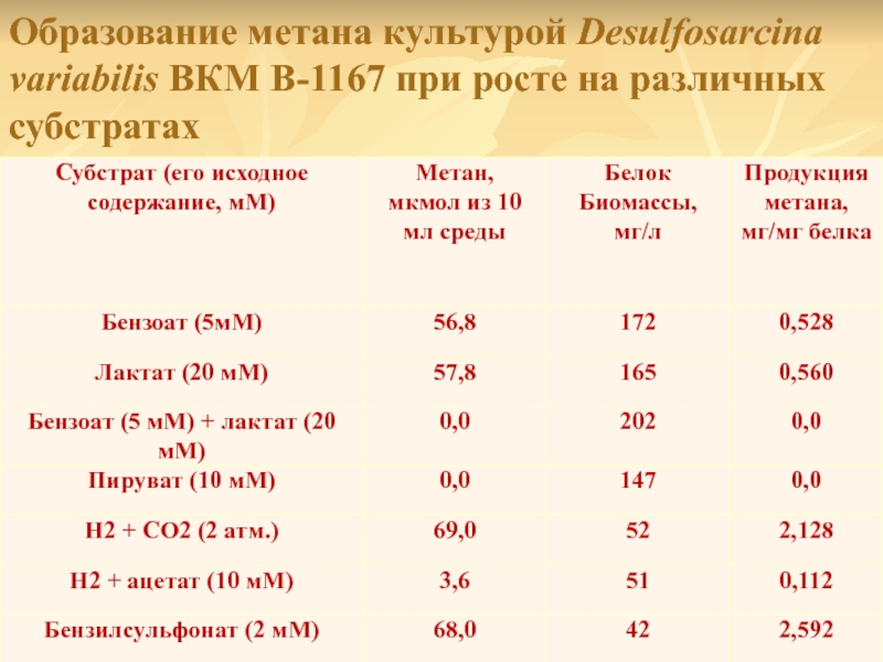 Слайд 24Образование метана культурой Desulfosarcina variabilis ВКМ В-1167 при росте на