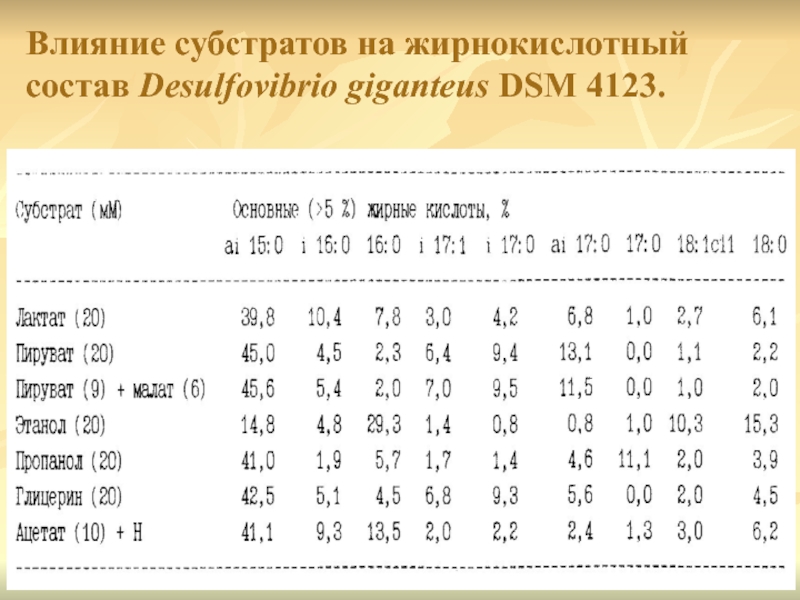 Слайд 12Влияние субстратов на жирнокислотный состав Desulfovibrio giganteus DSM 4123.