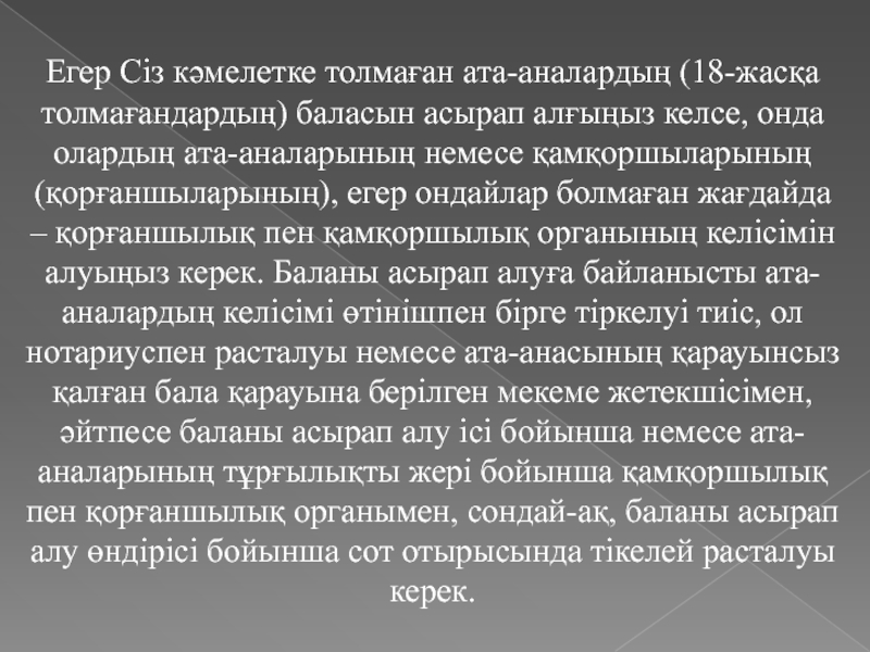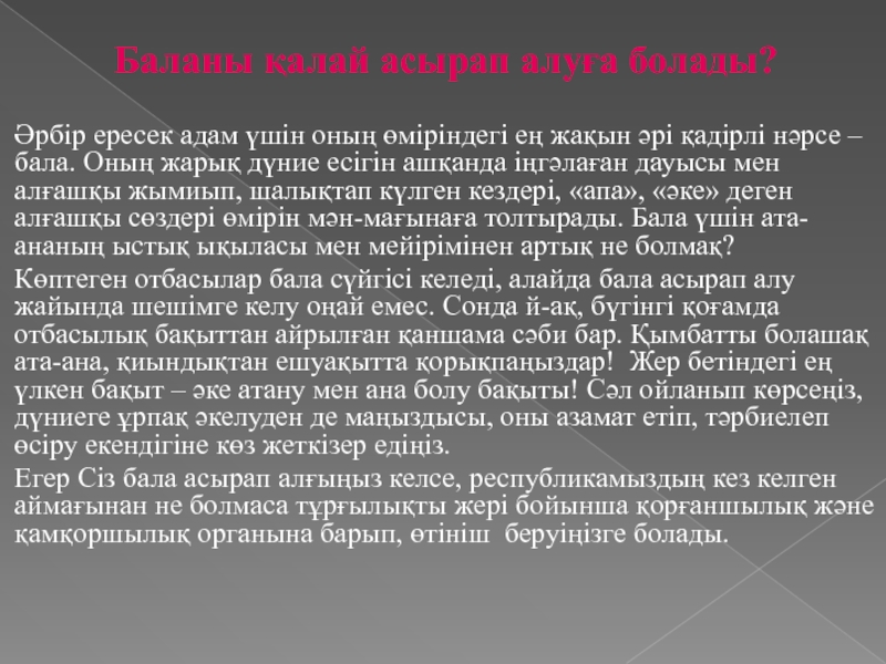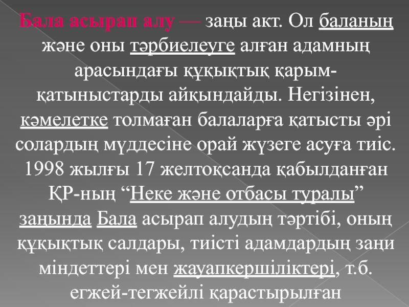 Слайд 2Бала асырап алу — заңы акт. Ол баланың және оны
