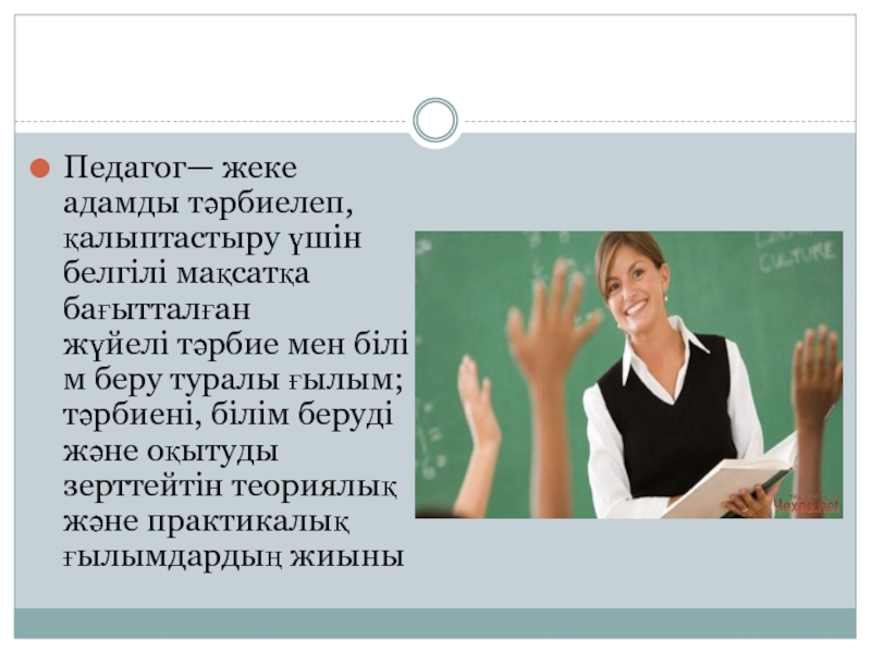 Слайд 5Педагог— жеке адамды тәрбиелеп, қалыптастыру үшін белгілі мақсатқа бағытталған жүйелі тәрбие мен білім беру туралы ғылым;