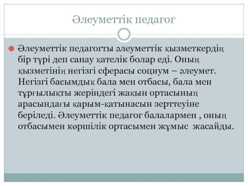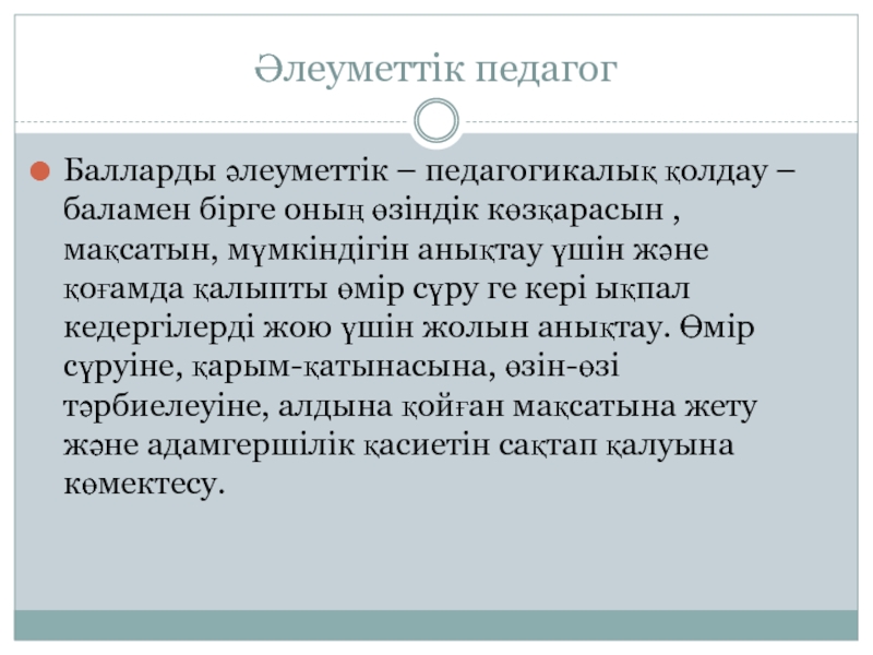 Әлеуметтік педагогБалларды әлеуметтік – педагогикалық қолдау – баламен бірге оның өзіндік көзқарасын , мақсатын, мүмкіндігін анықтау үшін