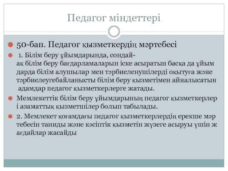 Педагог міндеттері50-бап. Педагог қызметкердің мәртебесі 1. Білім беру ұйымдарында, сондай-ақ білім беру бағдарламаларын іске асыратын басқа да ұйымдарда білім алушылар мен тәрбиеленушілерді оқытуға және тәрбиелеугебайланысты білім беру қызметімен айналысатын адамдар педагог қызметкерлерге жатады.Мемлекеттік білім беру ұйымдарының педагог қызметкерлері азаматтық қызметшілер болып табылады.2. Мемлекет қоғамдағы педагог қызметкерлердің ерекше мәртебесін таниды және кәсіптік қызметін жүзеге асыруы үшін жағдайлар жасайды