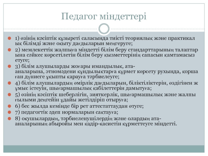 Педагог міндеттері1) өзінің кәсіптік құзыреті саласында тиісті теориялық және практикалық білімді және оқыту дағдыларын меңгеруге;2) мемлекеттік жалпыға міндетті білім беру стандарттарының талаптарына сәйкес көрсетілетін білім беру қызметтерінің сапасын қамтамасыз етуге;3) білім алушыларды жоғары имандылық, ата-аналарына, этномәдени құндылықтарға құрмет көрсету рухында, қоршаған дүниеге ұқыпты қарауға тәрбиелеуге;4) білім алушылардың өмірлік дағдыларын, біліктіліктерін, өздігінен жұмыс істеуін, шығарма­шылық қабілеттерін дамытуға;5) өзінің кәсіптік шеберлігін, зияткерлік, шығармашылық және жалпы ғылыми деңгейін ұдайы жетілдіріп отыруға;6) бес жылда кемінде бір рет аттестаттаудан өтуге;7) педагогтік әдеп нормаларын сақтауға;8) оқушылардың, тәрбиеленушілердің және олардың ата-аналарының абыройы мен қадір-қасиетін құрметтеуге міндетті.