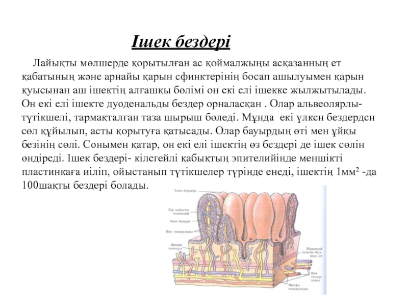 Слайд 10 Асқазан бездері- қарапайым түтікшелі, тармақталмаған. Өзектері асқазан шұңқырына