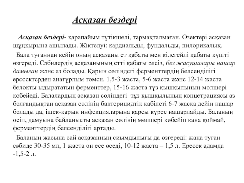 ет қабаты мен кілегейлі қабаты күшті өзгереді. Сәбилердің асқазанының етті қабаты әлсіз, без жасушалары нашар дамыған және аз болады. Қарын сөліндегі ферменттердің белсенділігі ересектерден анағүрлым төмен. 1,5-3 жаста, 5-6 жаста және 12-14 жаста белокты ыдырататын ферменттер, 15-16 жаста түз қышқылының мөлшері көбейеді. Балалардың асқазан сөліндегі тұз қышқылының концетрациясы аз болғандықтан асқазан сөлінің бактерицидтік қабілеті 6-7 жасқа дейін нашар болады да, ішек-қарын инфекцияларына қарсы күрес нашарлайды. Баланың осіп, дамуына байланысты асқазан сөлінің мөлшері көбейіп қана қоймай, ферменттердің белсенділігі артады.