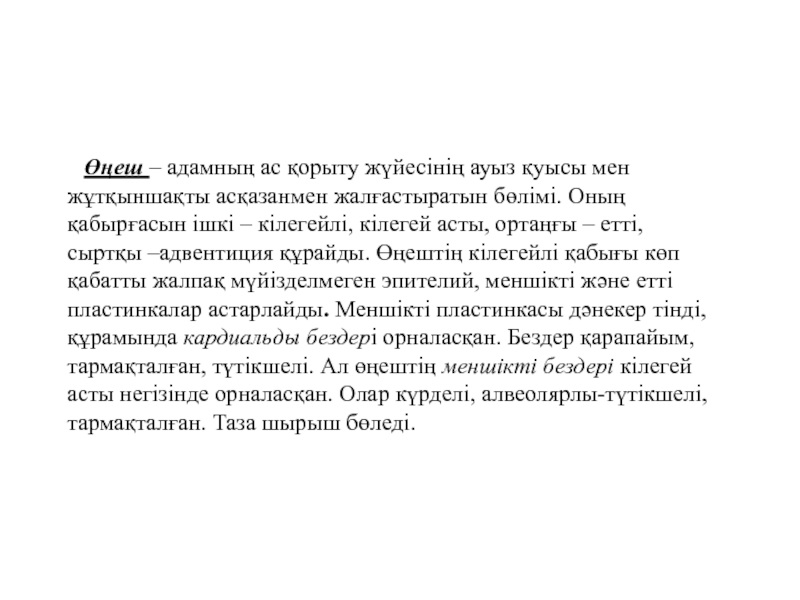асты, ортаңғы – етті, сыртқы –адвентиция құрайды. Өңештің кілегейлі қабығы көп қабатты жалпақ мүйізделмеген эпителий, меншікті және етті пластинкалар астарлайды. Меншікті пластинкасы дәнекер тінді, құрамында кардиальды бездері орналасқан. Бездер қарапайым, тармақталған, түтікшелі. Ал өңештің меншікті бездері кілегей асты негізінде орналасқан. Олар күрделі, алвеолярлы-түтікшелі, тармақталған. Таза шырыш бөледі.