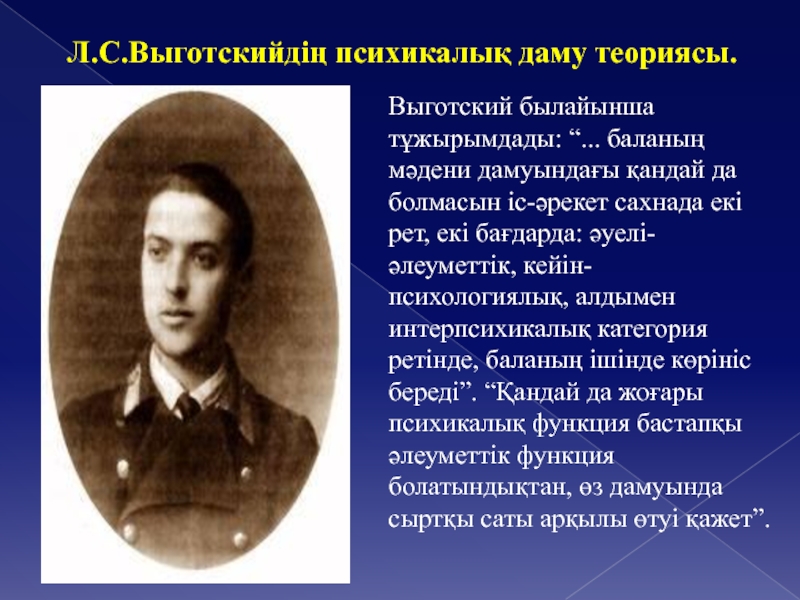 әлеуметтік, кейін- психологиялық, алдымен интерпсихикалық категория ретінде, баланың ішінде көрініс береді”. “Қандай да жоғары психикалық функция бастапқы әлеуметтік функция болатындықтан, өз дамуында сыртқы саты арқылы өтуі қажет”.