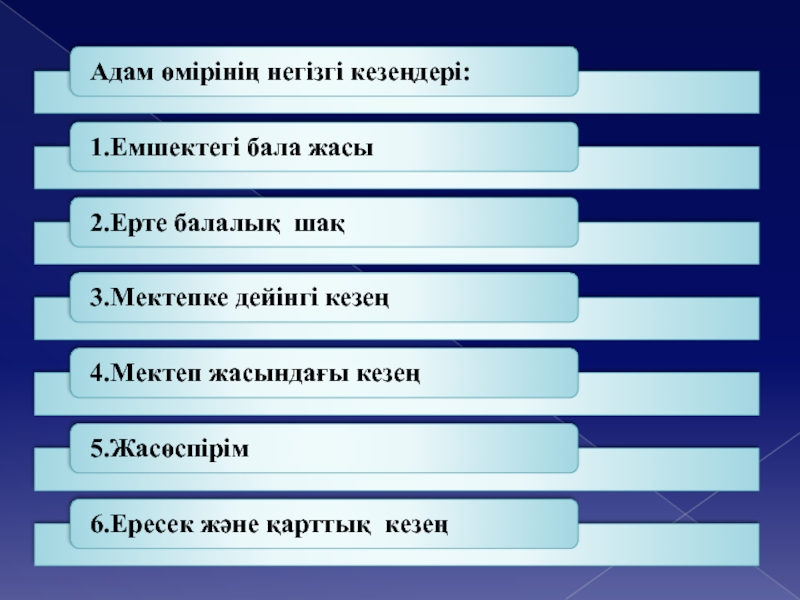 * 1-ден 3 жасқа дейінгі кезең- бөбектер жасы. Бұл кез баланың тілі  шығып, денесі нығайып, ойнай бастау