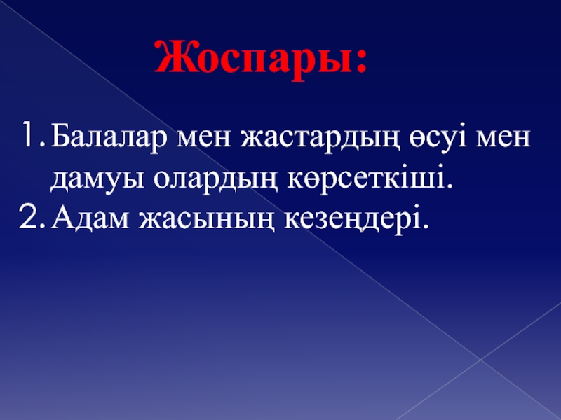 Жоспары:Балалар мен жастардың өсуі мен дамуы олардың көрсеткіші. Адам жасының кезеңдері.