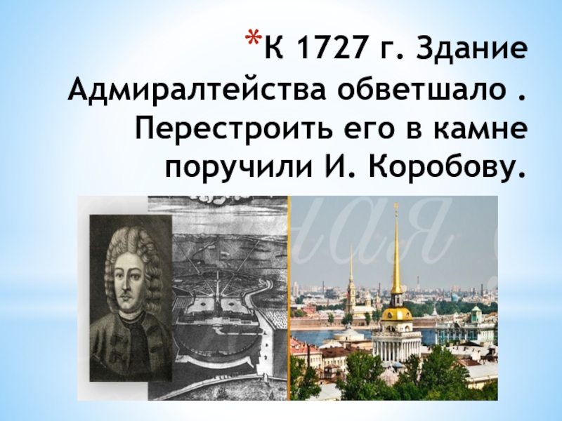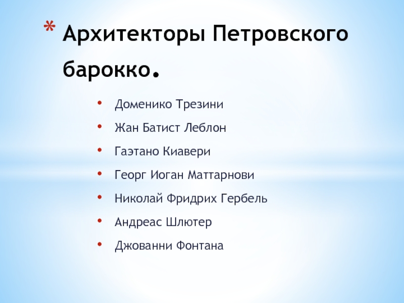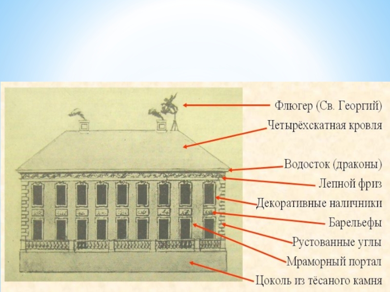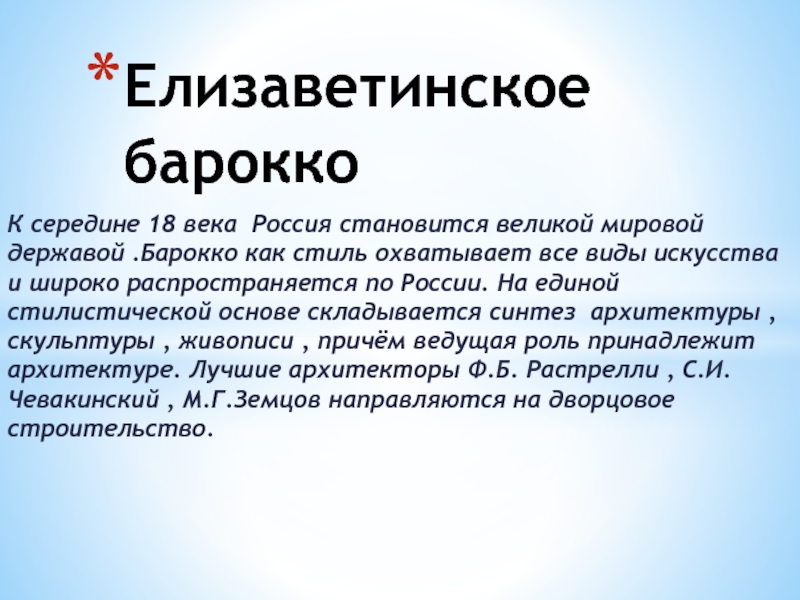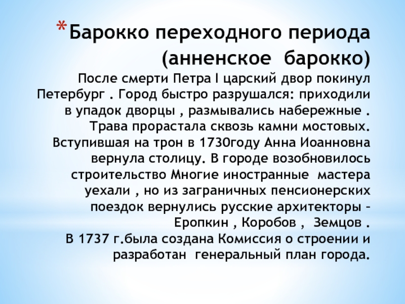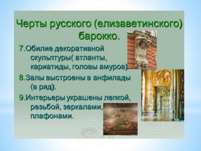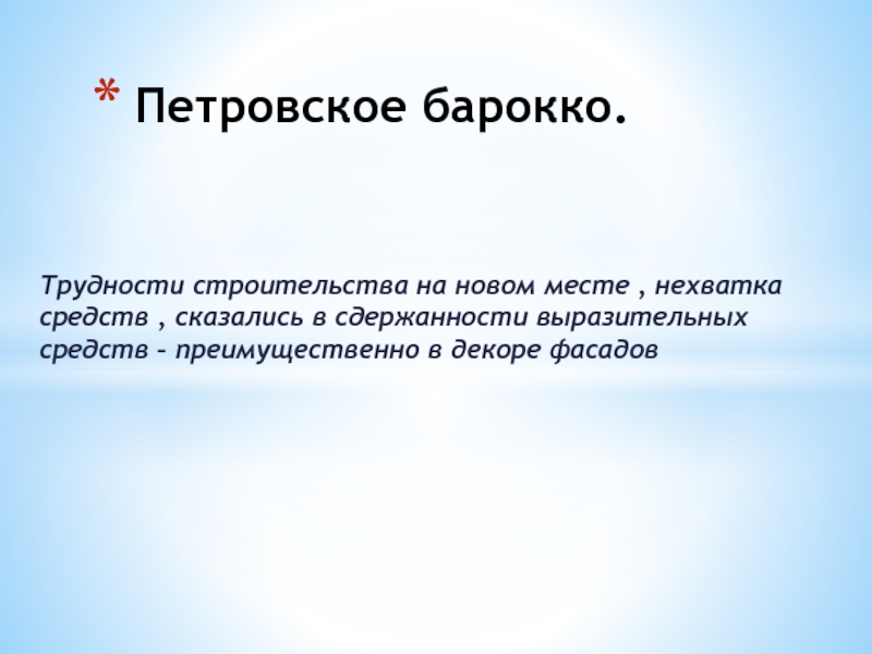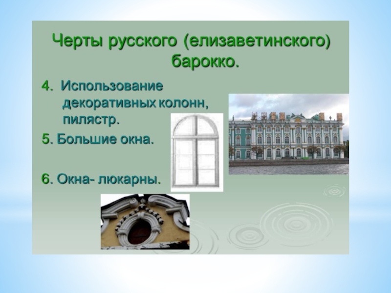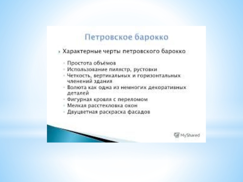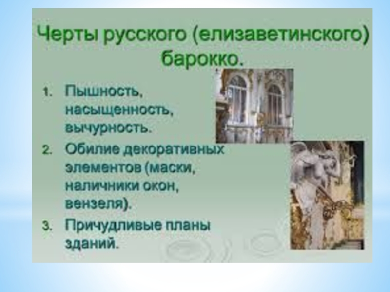 , в несколько видоизменённом и сдержанном виде ; сказывалось влияние голландской архитектуры и древнерусские традиции.Петербургское барокко делят на три этапа :