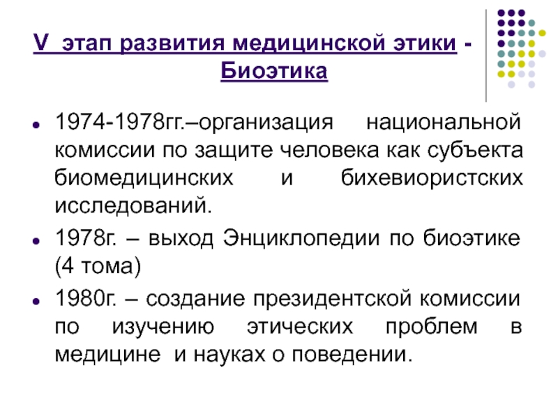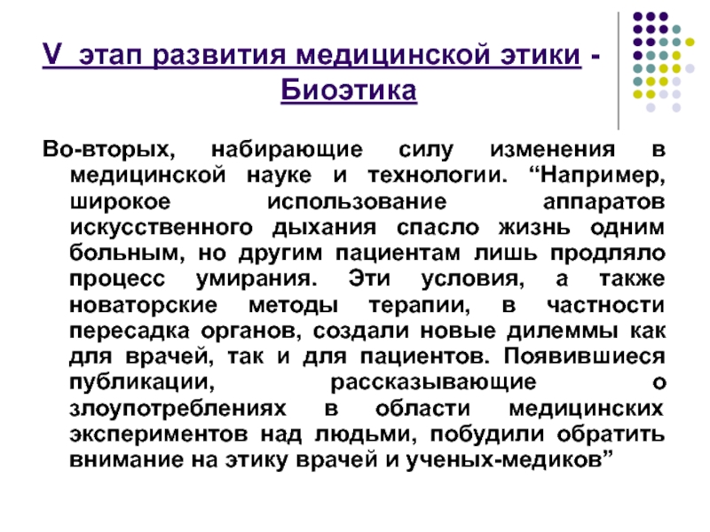 С 70х годов XX столетия начался новый V этап развития медицинской этики - биоэтика. Биоэтика возникла из соединения философии и медицины, но превратилась в практическую философию, дающую возможность мудрому врачу подняться до божественных высот при решении вопросов жизни и смерти.