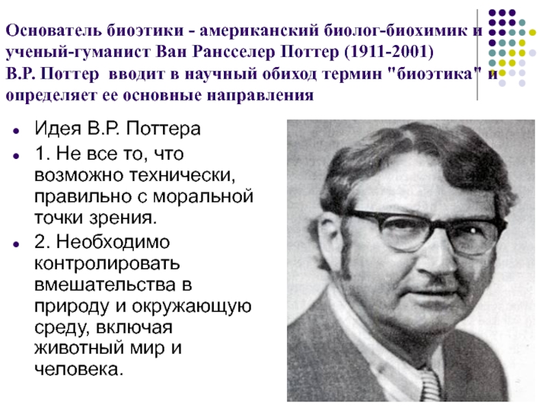 Слайд 5Основатель биоэтики - американский биолог-биохимик и ученый-гуманист Ван Рансселер Поттер