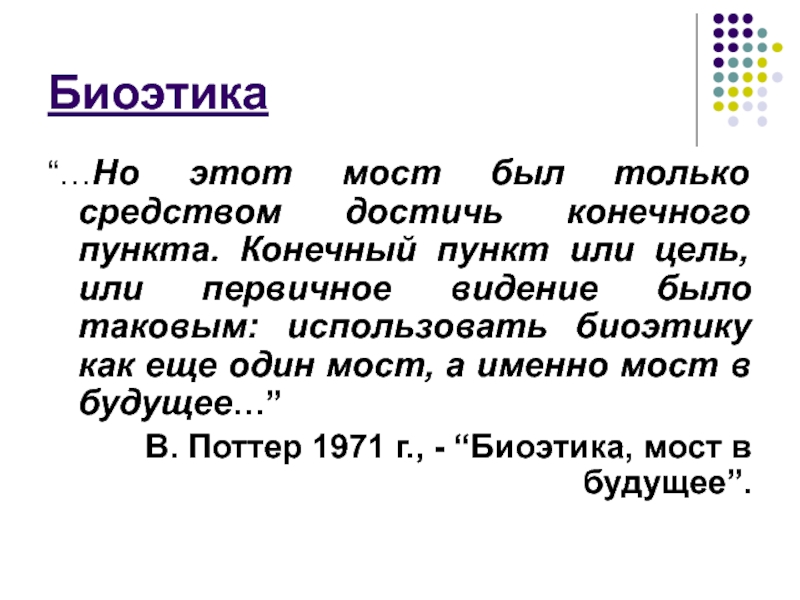 В. Поттер 1971 г., - “Биоэтика, мост в будущее”.