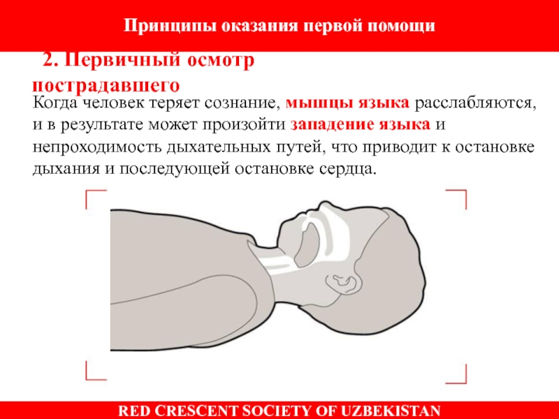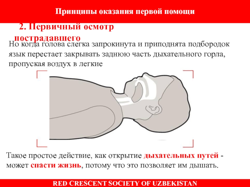 Но когда голова слегка запрокинута и приподнята подбородок язык перестает закрывать заднюю часть дыхательного горла, пропуская воздух в легкие
