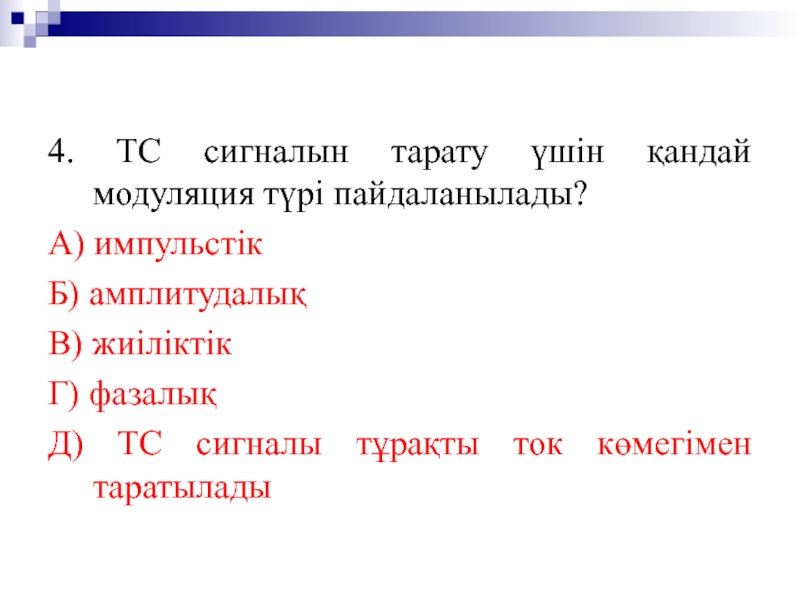 4. ТС сигналын тарату үшін қандай модуляция түрі пайдаланылады? А) импульстікБ) амплитудалықВ) жиіліктікГ) фазалықД) ТС сигналы тұрақты