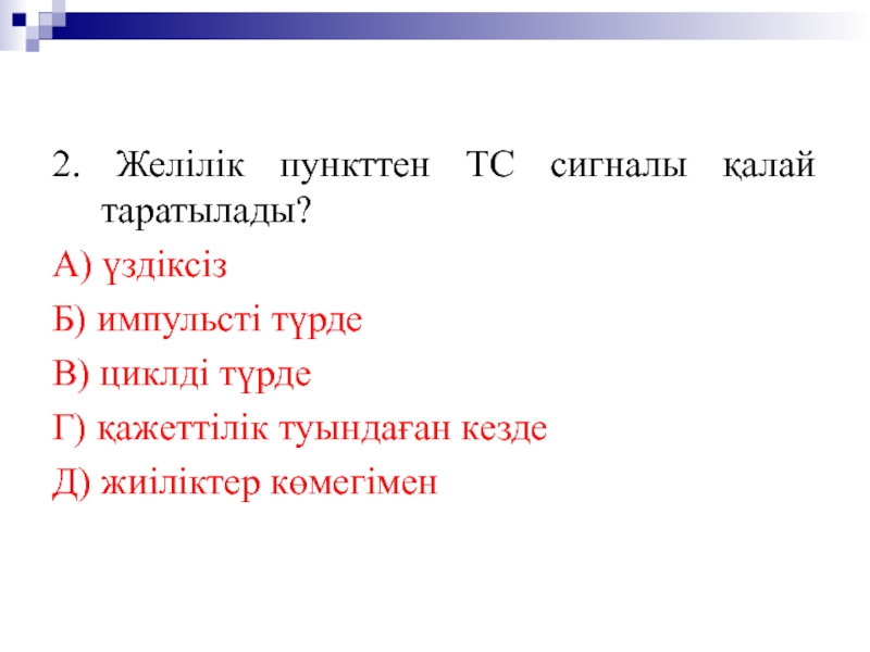 2. Желілік пункттен ТС сигналы қалай таратылады? А) үздіксізБ) импульсті түрдеВ) циклді түрдеГ) қажеттілік туындаған кездеД) жиіліктер