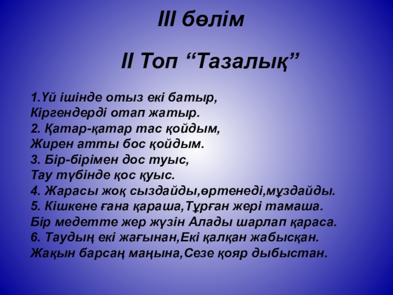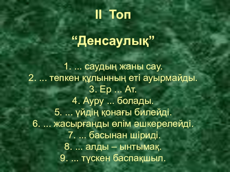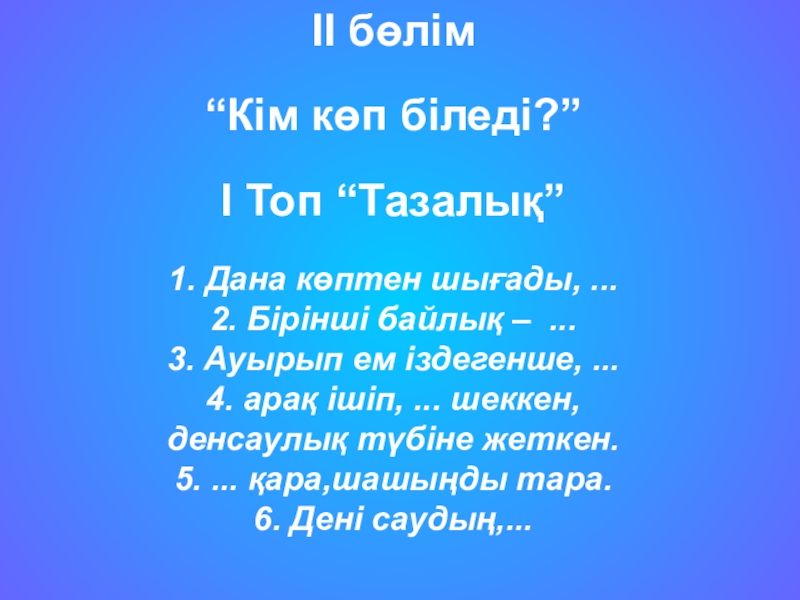 2. “Кім көп біледі?” (мақал-мәтелдің жалғасын табу)